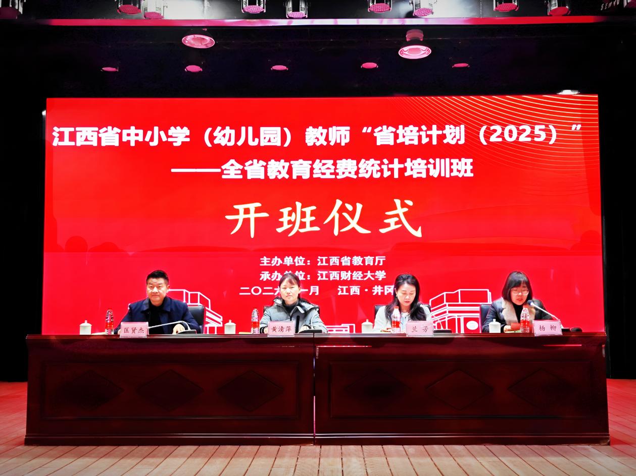 2026年1月5日上午,由江西省教育厅主办、江西财经大学承办的江西省中小学(幼儿园)教师“省培计划”(2025)—全省教育经费统计培训班在江西省教育厅井冈山教师培训中心顺利开班。江西省教育厅财务处三级调研员黄清萍、江西财经大学继续教育学院副院长兰芳、江西教育经费统计研究中心特聘专家匡贤杰等领导和专家出席了开班仪式。开班式由江西财经大学继续教育学院杨柳老师主持。来自全省各设区市、县(区)教育局的160余名学员参加培训。